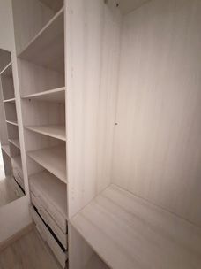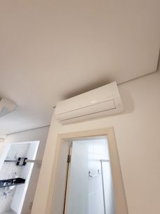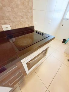 Unidade mobiliada com armários, fogão de indução, mesa, sofá, cama box e ar condicionado.